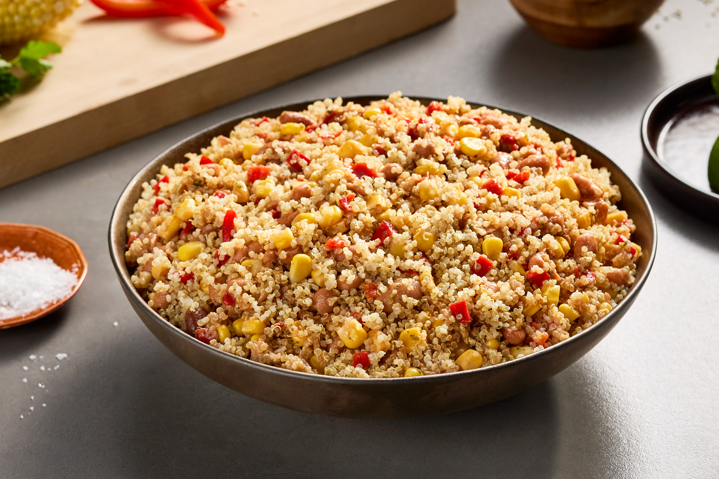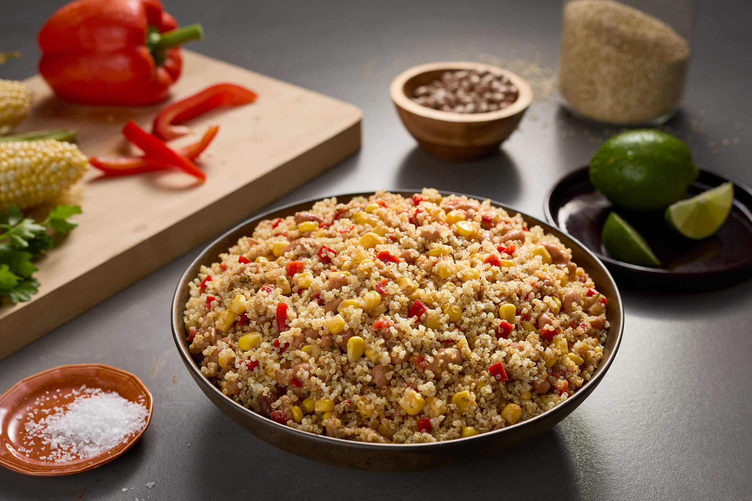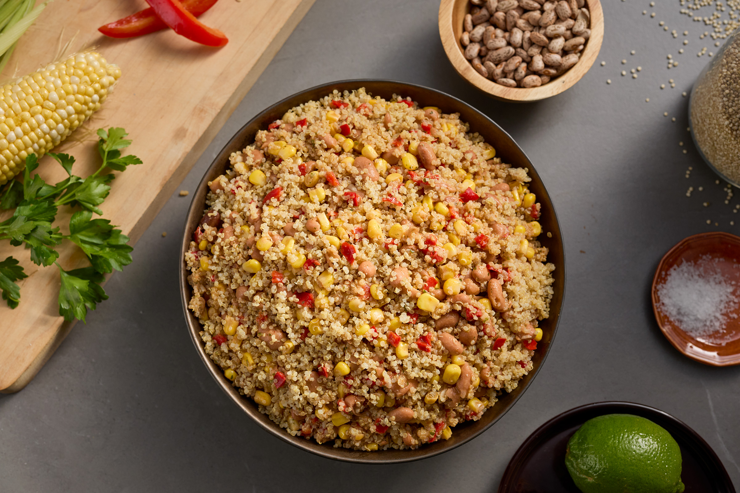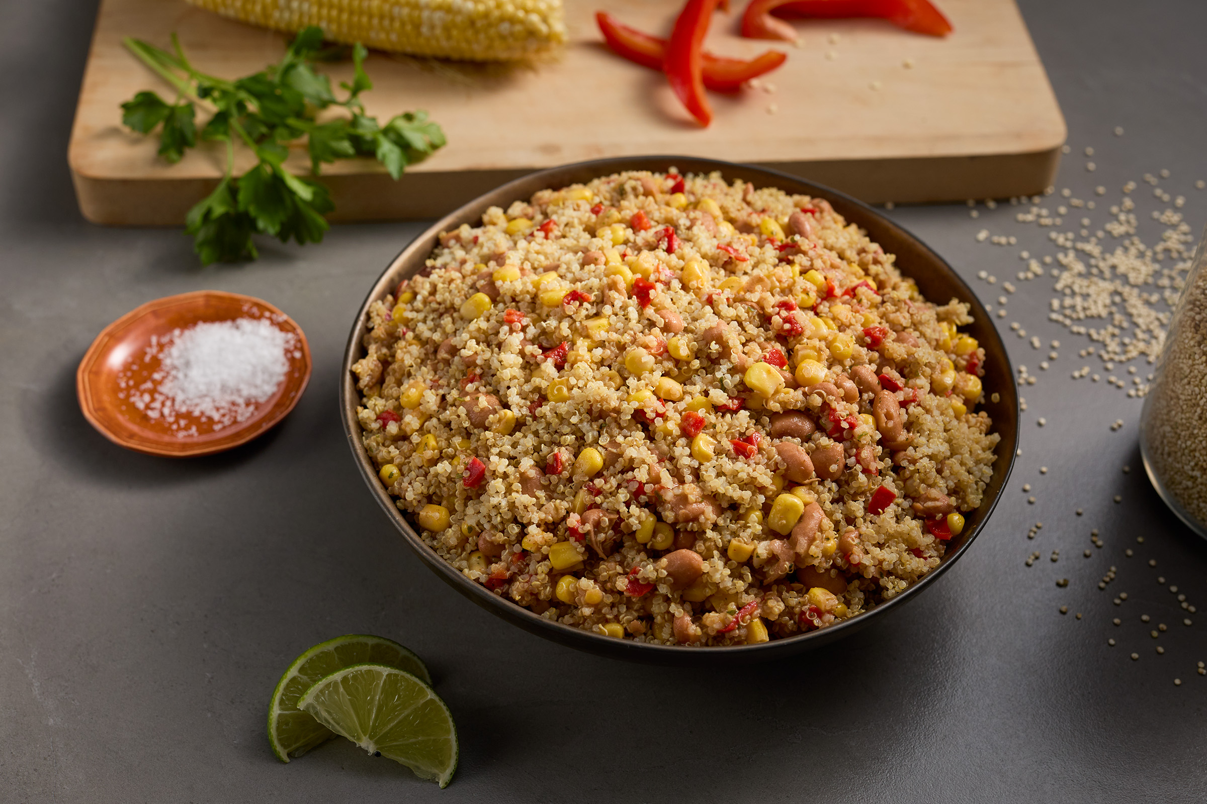 CORN, PINTO BEANS (ORGANIC PINTO BEANS, WATER, SEA SALT. KOMBU SEAWEED). RED BELL PEPPERS, LIME JUICE, OIL BLEND (CANOLA OIL, EXTRA VIRGIN OLIVE OIL), GARLIC,CILANTRO,CONTAINS LESS THAN 2% OF CHIPOTLE PEPPER BASE (RED CHILI PEPPERS. CHIPOTLE PEPPERS. SALT. NATURAL SMOKE FLAVOR (NATURAL SMOKE FLAVOR. NATURAL FLAVOR]), SAL T, SPICES, CHILI POWDER (CHILI PEPPER. SPICES. SALT. DEHYDRATED GARLIC).